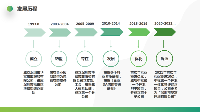 - 2002年1月,中标第一个环卫市场化项目(深圳市福田区市政道路清扫保洁项目)。