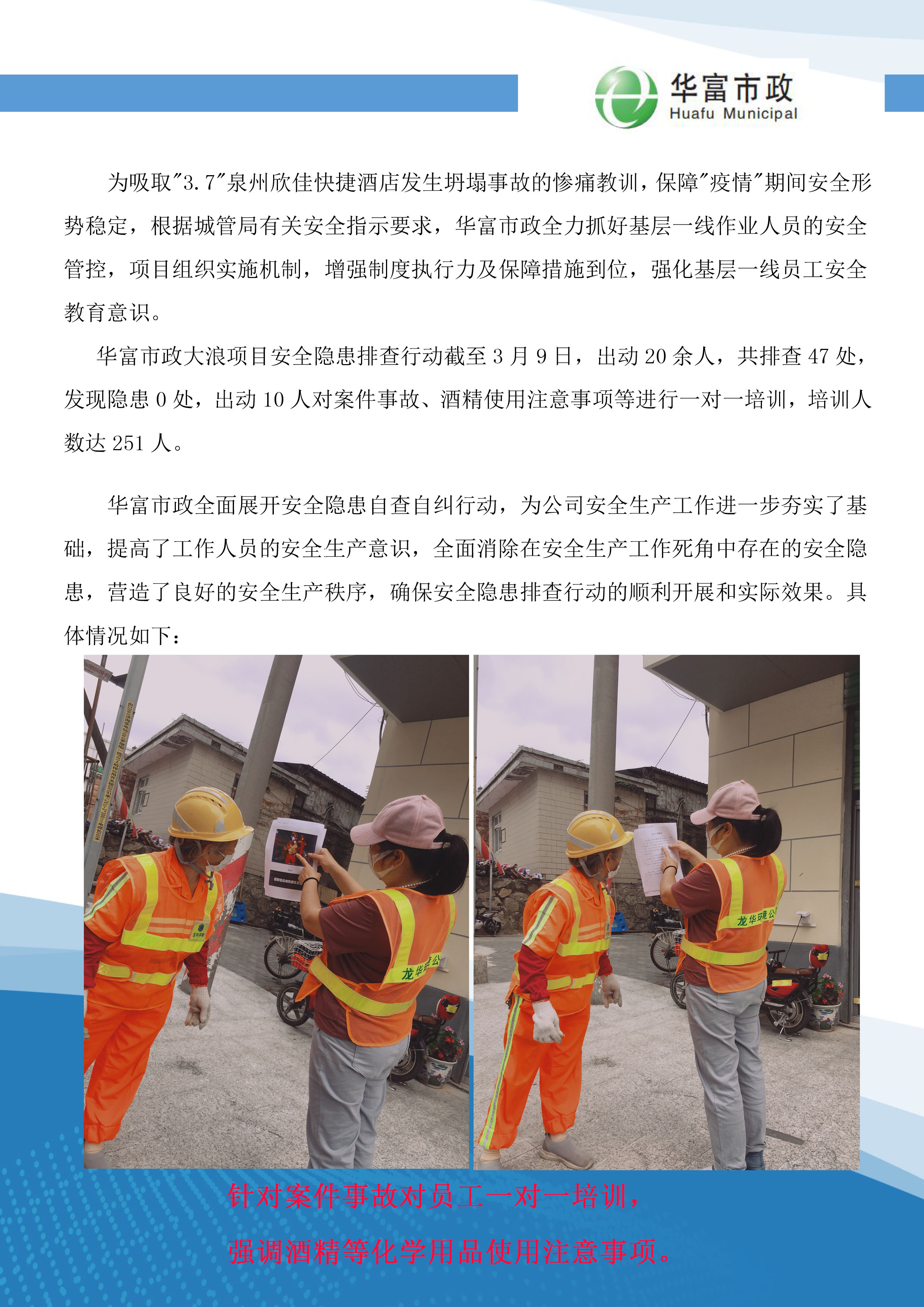 公司通过此次活动的开展,员工的安全意识得到了明显提升,在全项目范围内形成了浓厚的人人讲安全的良好氛围。并且,通过此次安全生产隐患排查专项行动的开展,我们也深刻地认识到安全生产对员工、对企业的重大意义,今后我们将一如既往地绷紧安全弦,巩固已有的安全成果,以大力开展安全标准化工作为龙头,认真组织员工学习安全标准化规范,并努力贯彻实施;加大安全投入及隐患治理力度;坚持经常性的安全生产自查自纠,强力带动安全生产工作的全面升级,把安全生产当成一项重要工作来抓,在公司内部形成安全生产长效机制,不断加大安全投入,加强安全教育,文明环保施工,全方位加强环卫保洁安全管理。