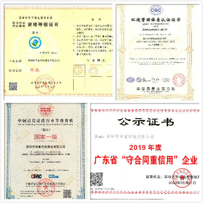 -通过《质量管理体系》、《环境管理体系》、《职业健康安全管理体系》认证;深圳市清洁服务行业甲级资质企业;获得《城市生活垃圾经营性清扫、收集、运输服务许可证》;