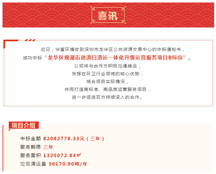 喜讯 | 稳步拓展——华富环境中标龙华区观湖街道清扫清运一体化升级运营服务项目B标段