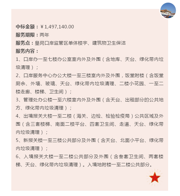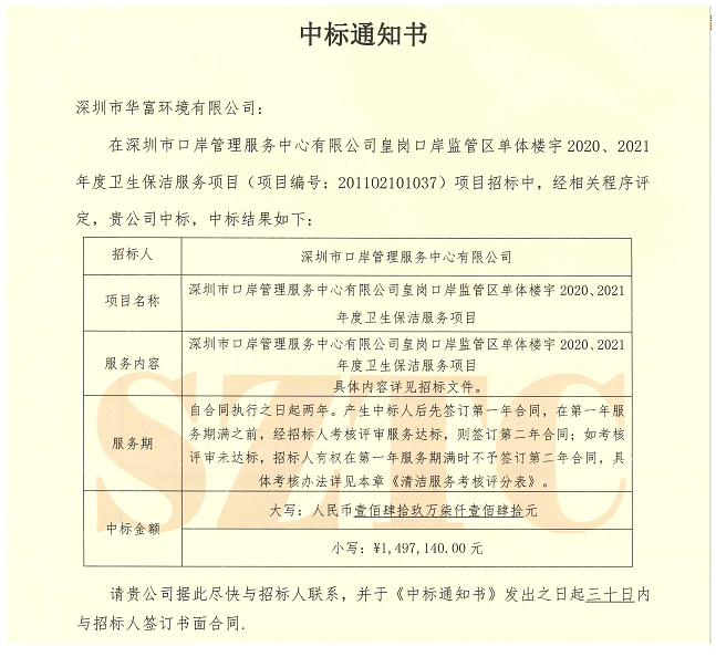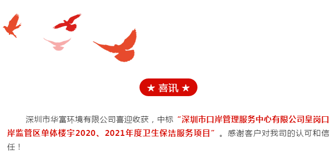 喜讯 | 华富环境中标“深圳市口岸管理服务中心有限公司皇岗口岸监管区单体楼宇2020、2021年度卫生保洁服务项目”