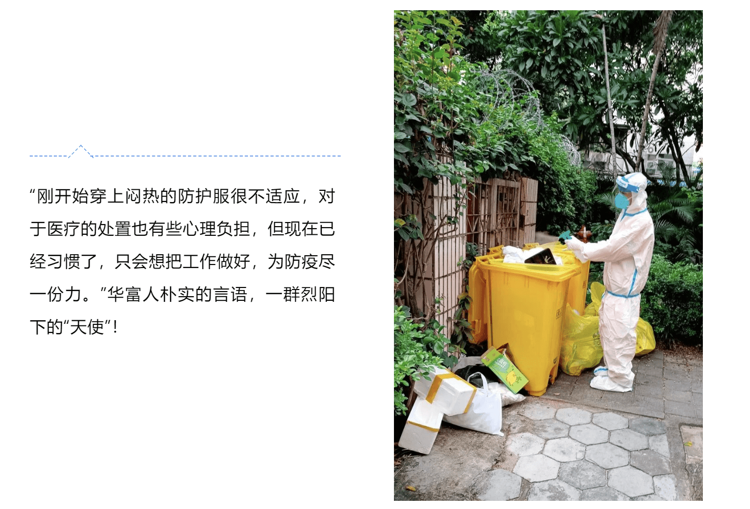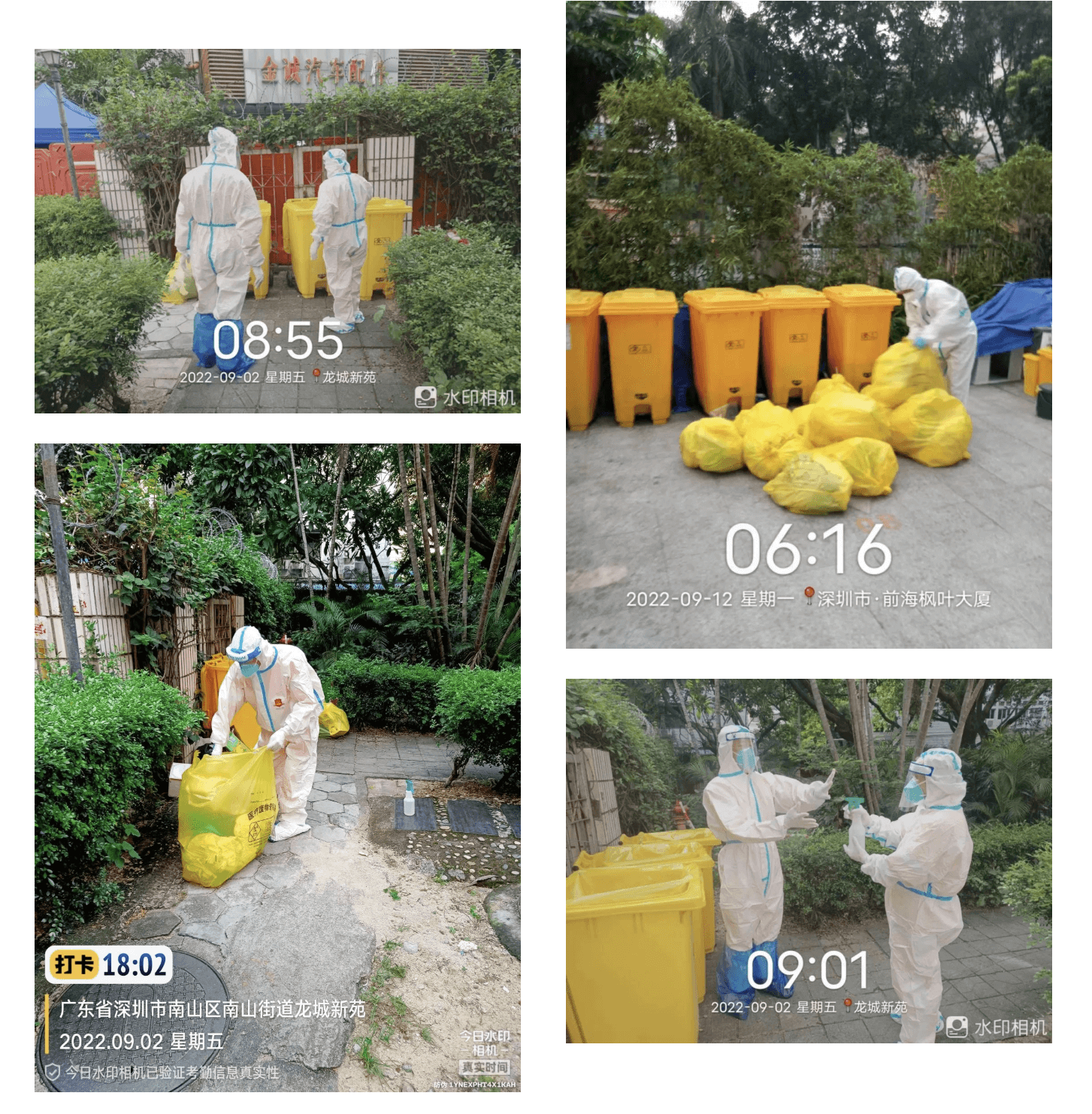 疫情期间,医废垃圾的收运任务,相比平时要艰巨许多,公司清运涉疫医疗垃圾,随着社会面核酸检测工作的不断开展,华富人“全副武装”穿梭于南山街道学校等社区,收集、转运各核酸检测采样点医疗废物等垃圾。每次收运前,黄色垃圾袋都需要均匀喷洒消毒液,边边角角都不能放过,再将医用垃圾袋打包、替换,替换时严格按照作业规范进行,替换结束后再次对桶内进行消杀。垃圾袋装车后,对车辆进行全方位消杀,专人、专车、专袋的运送到垃圾焚烧发电厂进行统一处置。