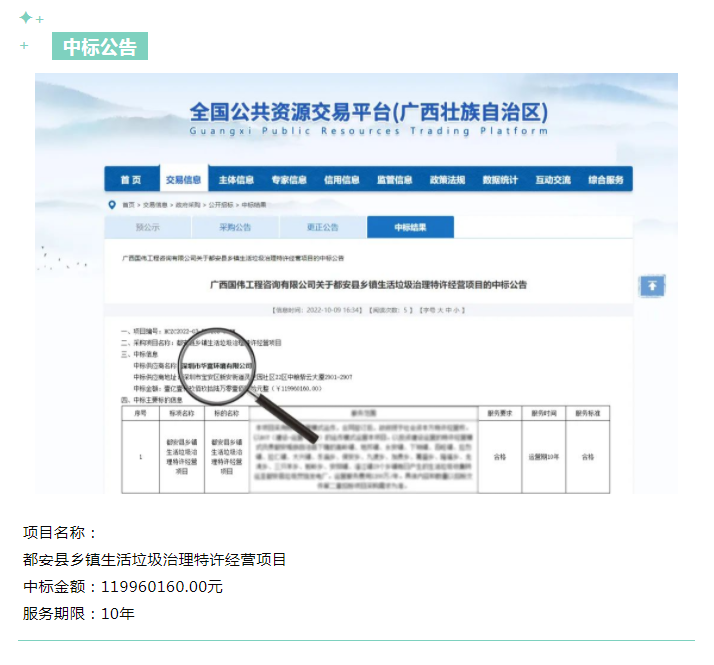 NG电子游戏步履不歇,继中标“都安瑶族自治县城区智慧环卫市场化服务项目”后,中标“都安县乡镇生活垃圾治理特许经营项目”。