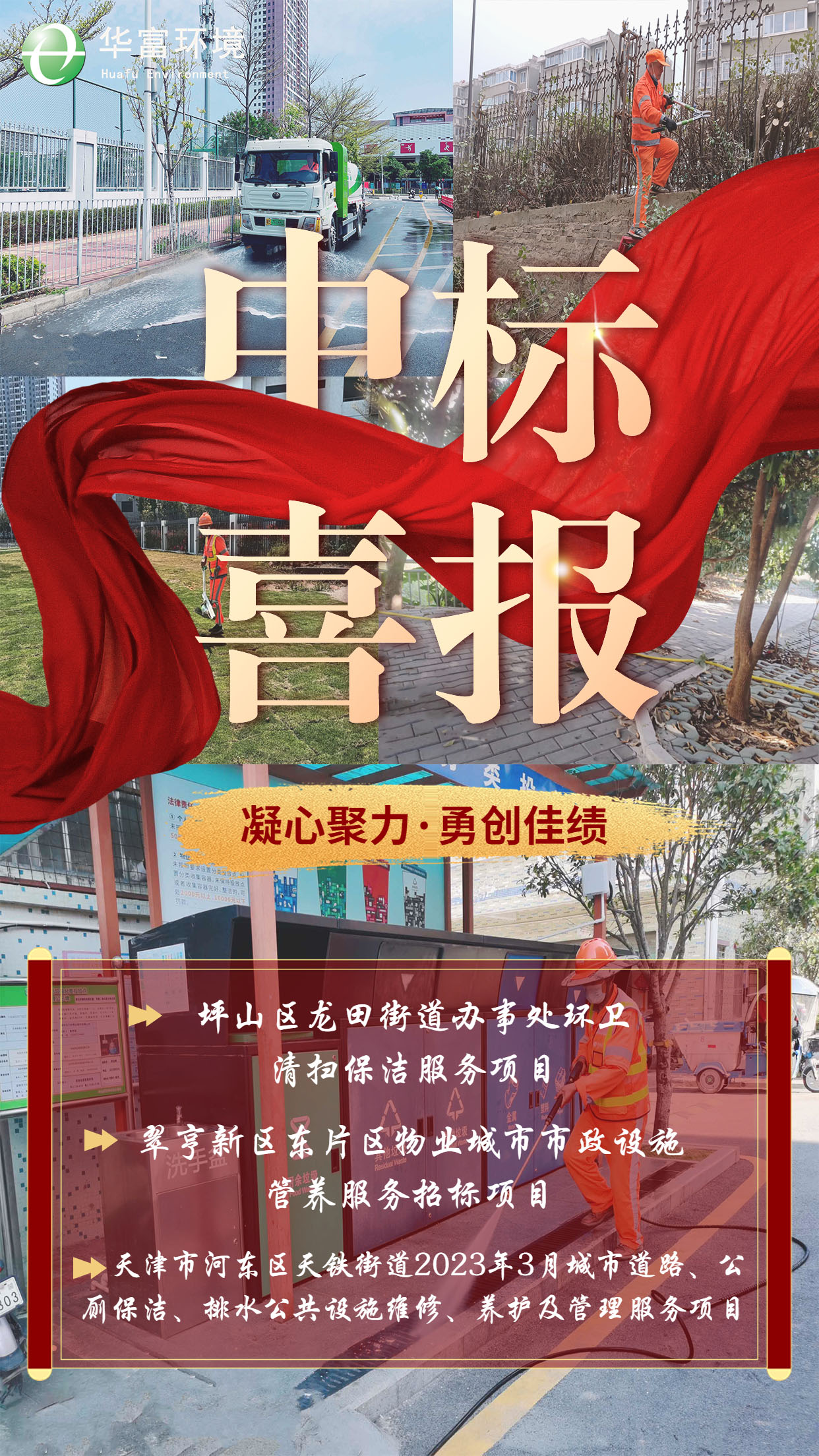 烟花三月,生机盎然,华富环境喜报频传,凭借深耕环卫行业三十年的雄厚综合实力,成功中标“坪山区龙田街道办事处环卫清扫保洁服务项目”、“天津市河东区天铁街道2023年3月城市道路、公厕保洁、排水公共设施维修、养护及管理服务项目”、“翠亨新区东片区物业城市市政设施管养服务招标项目”。