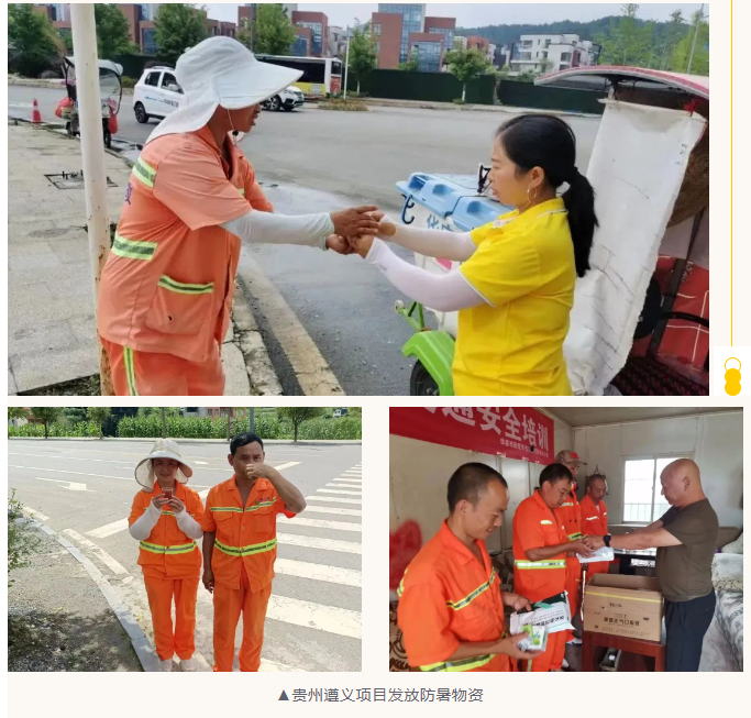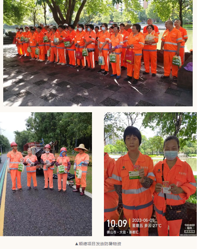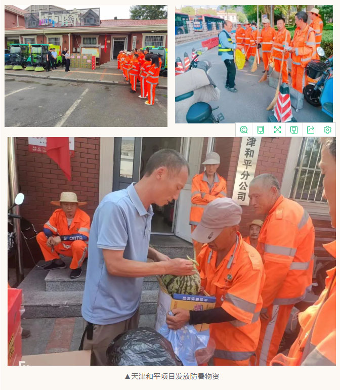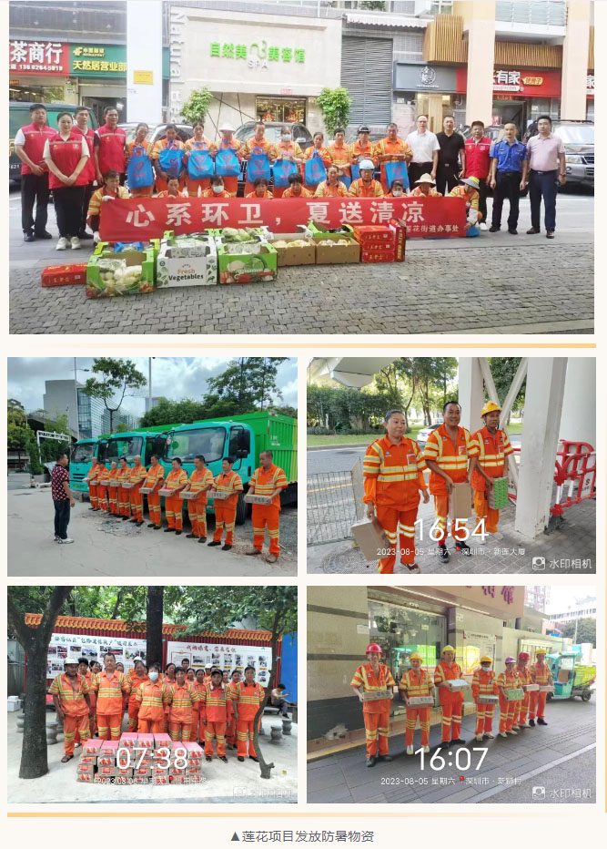 为缓解高温天气给环卫员工们带来的不适,我司于7、8月份积极开展了形式多样的2023年“夏日送清凉,关爱环卫工人”活动。公司领导、各项目经理为坚守在烈日下辛勤工作的环卫员工们发放了绿豆汤、藿香正气水、凉茶、板蓝根、清凉油等防暑降温用品和药品。切实把慰问、关怀落到实处,为大家送去丝丝清凉。