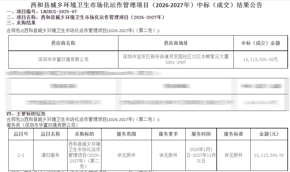 从初次履约到连续中标,华富环境以 “稳品质、强落地” 的作业标准,在两年服务中收获了认可与信赖;此次 “三连中”,是西和对我们专业能力的深度肯定。未来两年,我们将带着更成熟的服务经验、更精细的作业体系,继续守护西和城乡洁净,以实际行动兑现 “长期陪伴、持续向好” 的承诺。