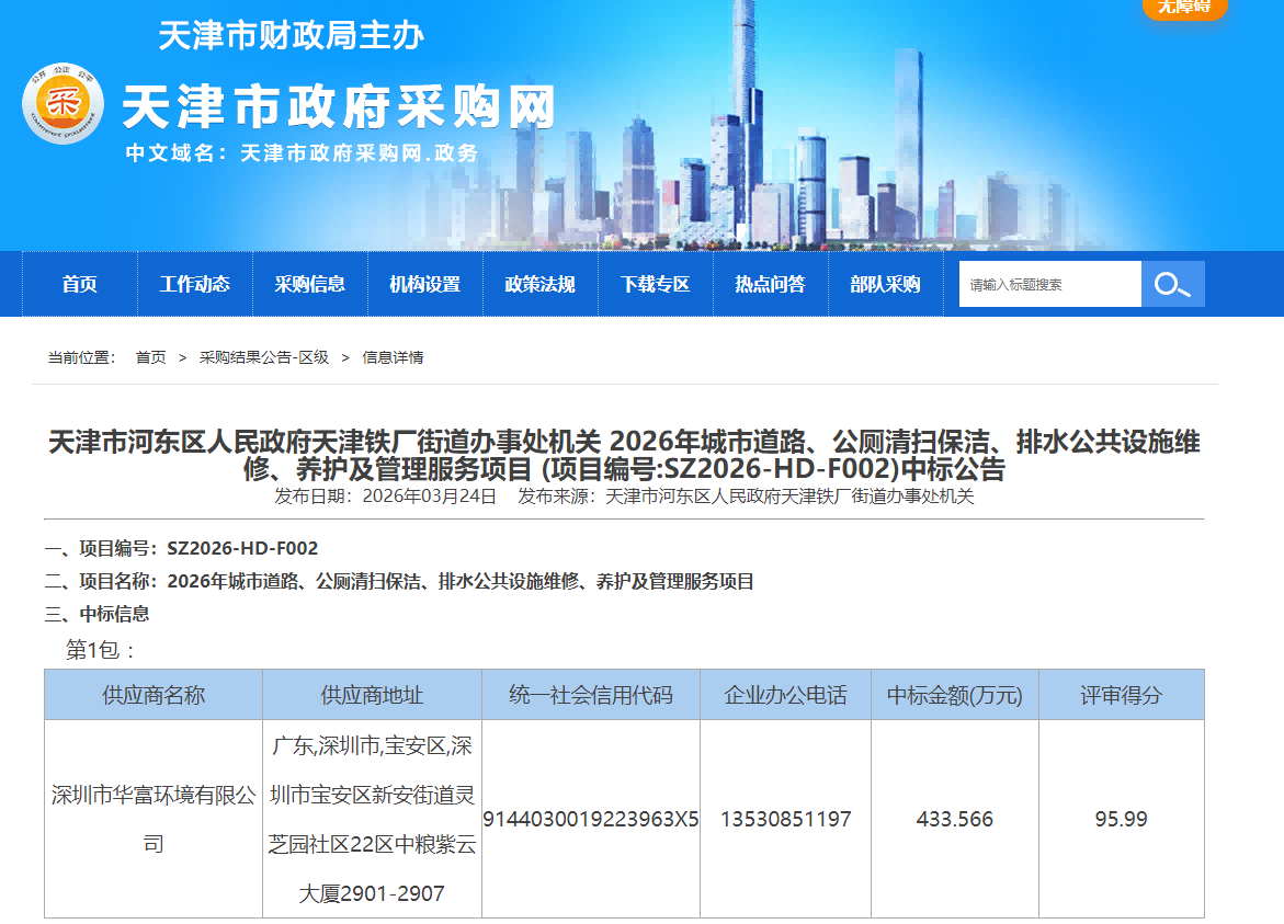 ● 蝉联中标天津河东区2026年城市道路、公厕清扫保洁、排水公共设施维修、养护及管理服务项目,延续了与河东区的深度合作;