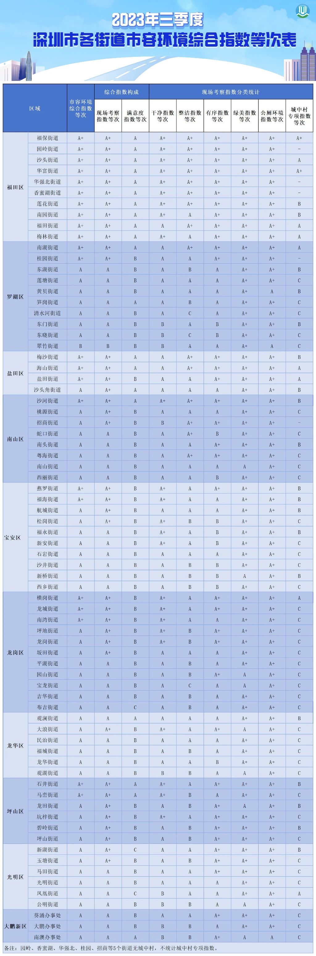 全市74个街道中,23个街道市容环境综合指数达到A+等次,其中福田区10个街道全部进入领跑梯队,盐田、龙岗区各3个,罗湖、宝安、坪山区各2个,南山区1个;50个街道为A等次;1个街道为B等次。